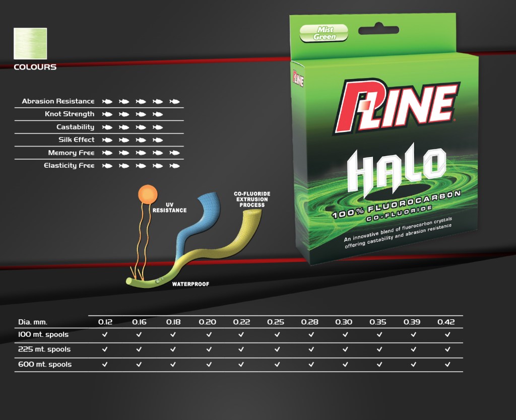 D – HALO – Dank der fortschrittlichen Extrusionstechnologie, dem Einsatz der besten verfügbaren Rohmaterialien und eines bemerkenswerten wirtschaftlichen Einsatzes zur Unterstützung der Forschung und Entwicklung war P-Line in der Lage die neueste Generation der Monofile aus Fluorkohlenstoff, die als co-fluoride bezeichnet werden, herzustellen, die alle Erwartungen der Angler übertrifft. Im Gegensatz zum normalen Fluorkohlenstoff ist ein co-fluoride aus einer „Mischung“ aus verschiedenen reinen Fluorocarbon-Kristallen zusammengesetzt. Da bekanntlich die verschiedenen Kristalle unterschiedliche Eigenschaften haben, war es möglich diese so zu „mischen“, dass die bestmögliche Kombination entstand, die dem Halo lineare Stärke und eine gute Wet-Knot-Stärke, ein sehr schwaches mechanisches Gedächtnis und dank der Gleichförmigkeit der Oberfläche, ein ausgezeichnetes Gleitvermögen beim Auswurf verleiht. Da Halo zu 100 % aus Fluorocarbon besteht, wird kein Wasser aufgenommen, ist der Lichtbrechungsindex sehr niedrig und somit ist die Schnur im Wasser unsichtbar, ist das spezifische Gewicht im Vergleich zur herkömmlichen Schnur viel höher, versinkt die Schnur damit schneller, hat eine sehr geringe Dehnung und ist beständig gegen UV-Strahlen. Halo ist ein Produkt mit der neuen durchsichtigen Färbung Apfelgrün, die sich besonders für das Angeln in Seen, Flüssen und Salzwasser eignet.